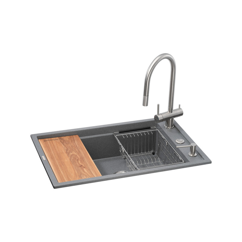 Кухонна станція GRANADO Royal – це розкішна знахідка для функціональної кухні! Ми подбали про те, щоб ваш простір був ретельно організований, а використання мийки було максимально зручним. Ми зібрали для вас мийку, подрібнювач, змішувач, диспенсер, металеву корзину та кухонну дошку.