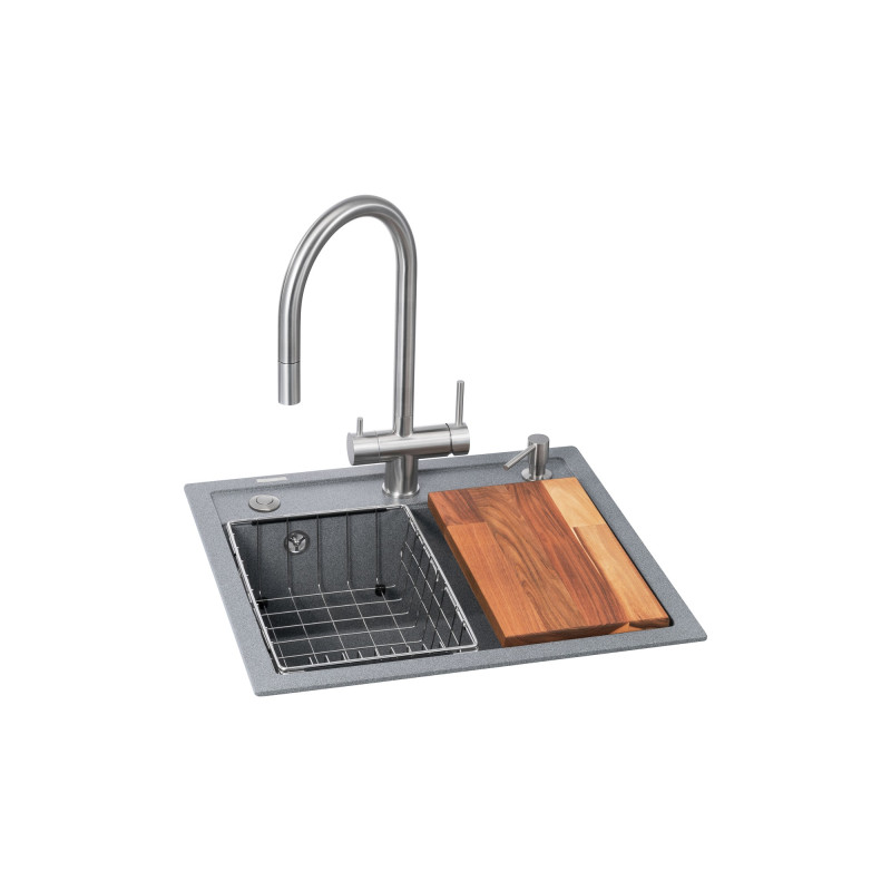 Кухонна станція GRANADO Royal Lerida - набір преміум класу, що включає кухонну мийку, мусороуловлювач, змішувач для води, диспенсер, металевий кошик і обробну дошку. Ось як отримати індивідуальну консультацію наших експертів, ретельно підібрати кожну деталь відповідно до стилю, продумати максимальну функціональність своєї кухні – і все це в один клік.