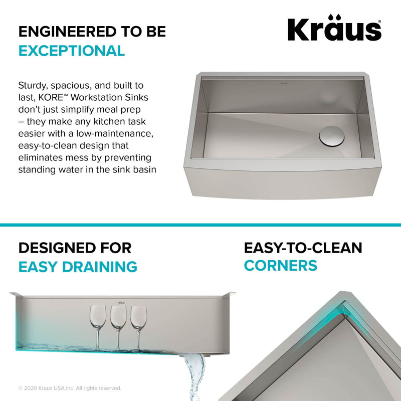 З мийкою Kore™ Workstation, ідеальною помічницею для сучасного домашнього шеф-кухаря, ви встигаєтезробити набагато більше. Натхнена професійними кухнями, серія Kore™ Workstation миттєво перетворює вашу кухонну мийку на повноцінну станцію підготовки. Ця мийка з фартуховим краєм, виконана в традиційному американському стилі, поєднує в собі практичну зручність та чарівний стиль кантрі. Мийка, яка буде довговічною як за красою, так і за експлуатаційними характеристиками, створює на кухні центр уваги та миттєво покращує її інтер'єр. В комплекті з аксесуарами преміум-класу, такими як багатоцільова сушарка для посуду та бамбукова обробна дошка, інтегрована система виступів дозволяє вам мити та сушити посуд або шаткувати та нарізати продукти безпосередньонад мийкою, не втрачаючи жодного сантиметра простору на стільниці. Виготовлена з нержавіючої сталі 16 калібру, ця кухонна "робоча конячка" є однією з найміцніших і довговічніших мийок на ринку. Сучасний зовнішній вигляд та дизайн, натхненний кулінарним мистецтвом професіоналів, миттєво оновлює будь-яку домашню кухню. Підніміть функціональність вашої кухонної мийки на абсолютно новий рівень за допомогою Kore™ Workstation та відчуйте різницю з Kraus.