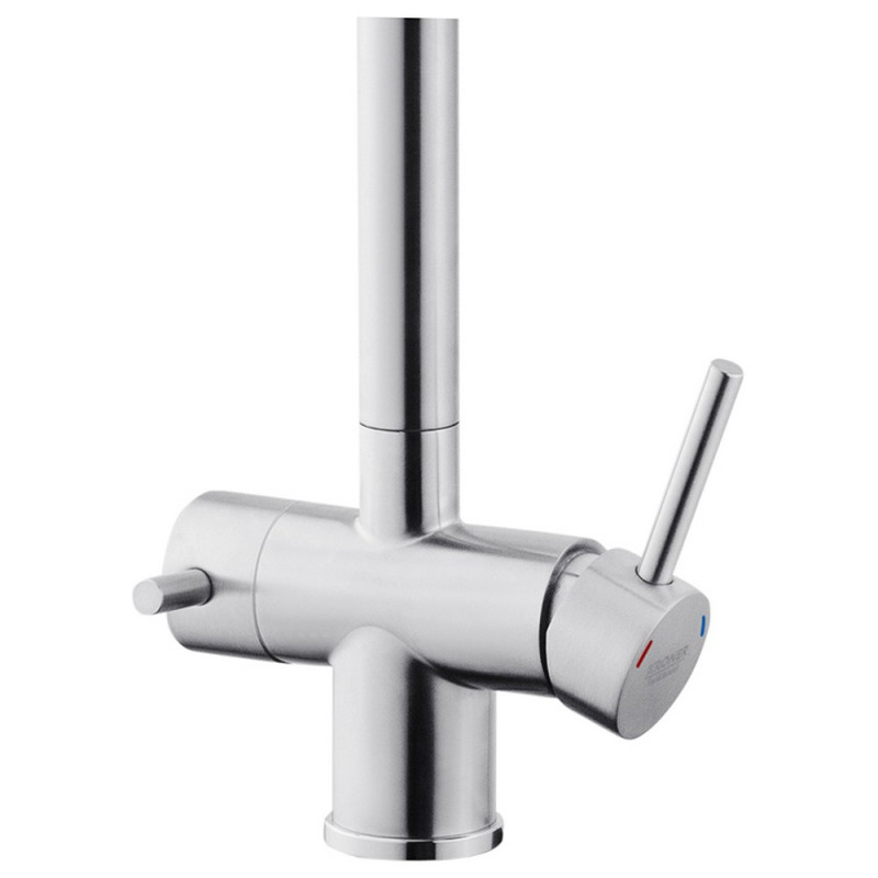Змішувач для кухні з підключенням до фільтра Кронера (KRP) Edelstahl Klassisch-ESG03815BLKвиготовлений з високоякісної нержавіючої сталі, яка не піддається корозії, стійка до ударів і тріщин. Змішувач має П-подібну форму з 3 контурами підключення води. За участю першого і другого здійснюються холодні і гарячі з'єднанняводи, де змішування відбувається за допомогою картриджа.