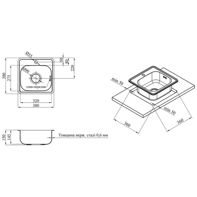 Мийка для кухні Kroner KRP Satin-383806160 38х38 см нержавіюча сталь CV022756