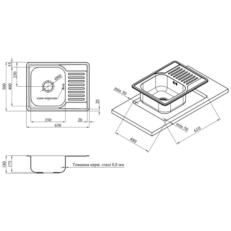 Мийка для кухні Kroner KRP Satin-635008180 63х50 см нержавіюча сталь CV022779