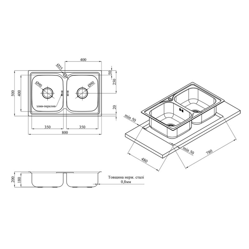 Кухонна подвійна мийка Kroner KRP Satin-7948Z 80х50 см нержавіюча сталь