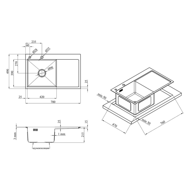 Мийка для кухні Kroner KRP Schwarze-7849LHM 78х49 см крило справа нержавіюча сталь чорний PVD CV025278