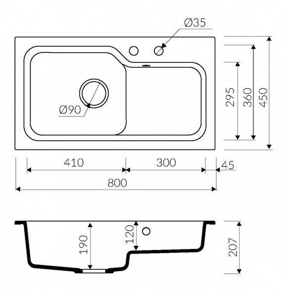 - Діаметр зливного отвору, мм (дюйм): 90