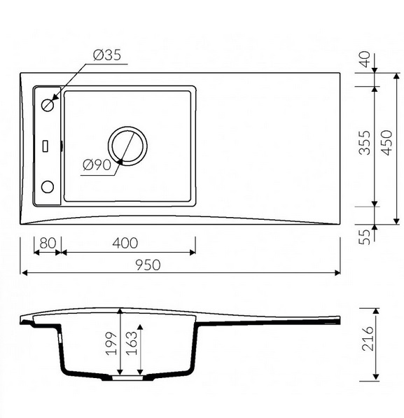 - Діаметр зливного отвору, мм (дюйм): 90