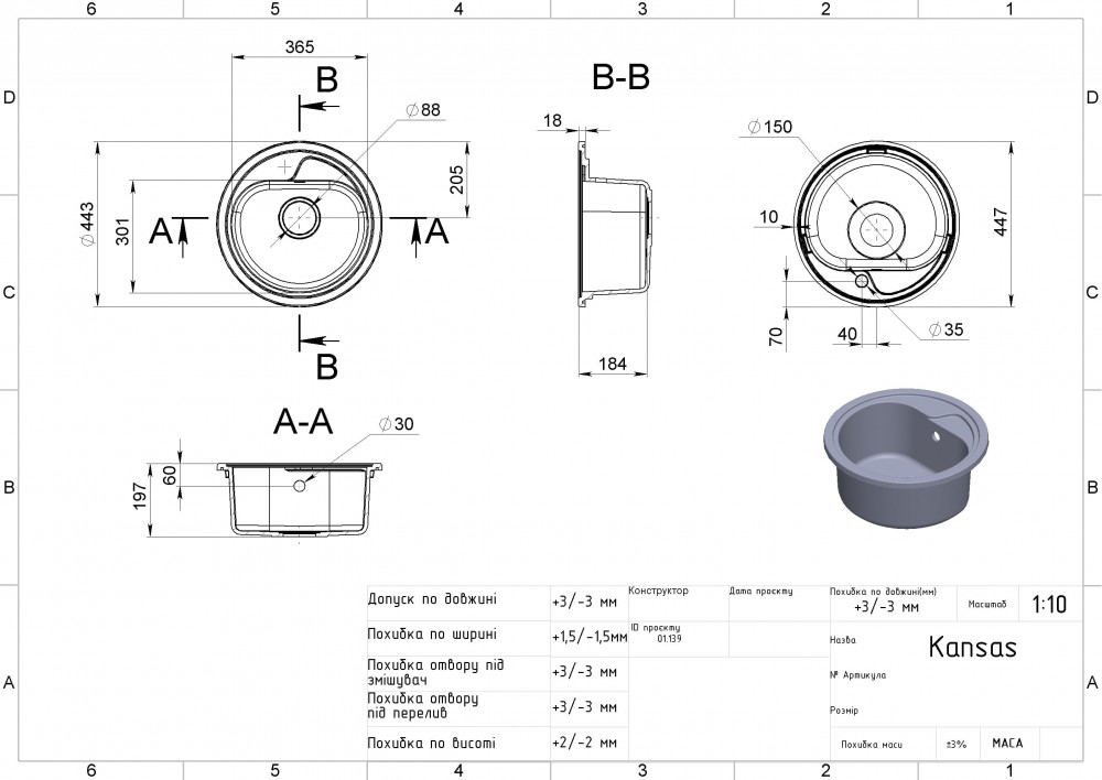 Мийка для кухні Miraggio Kansas Ø44,7 см кварцовий пісок Mirastone чорний 0000090
