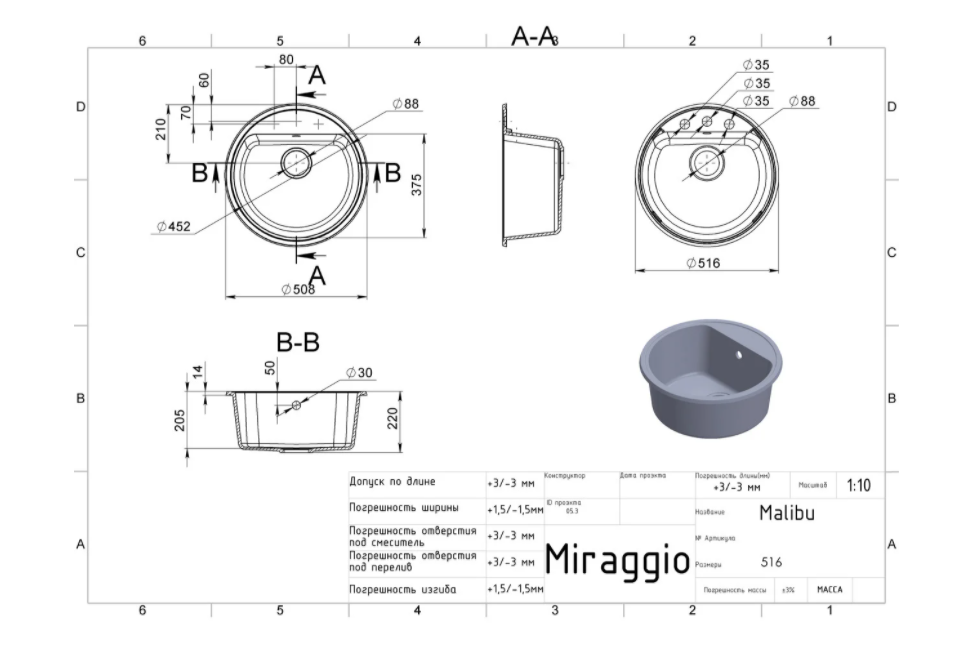 1) Мийка для кухні Miraggio Malibu 517x517x221 врізна кругла з переливом матовий