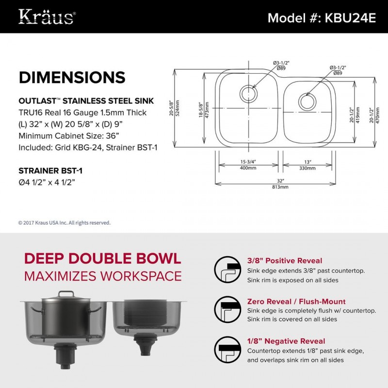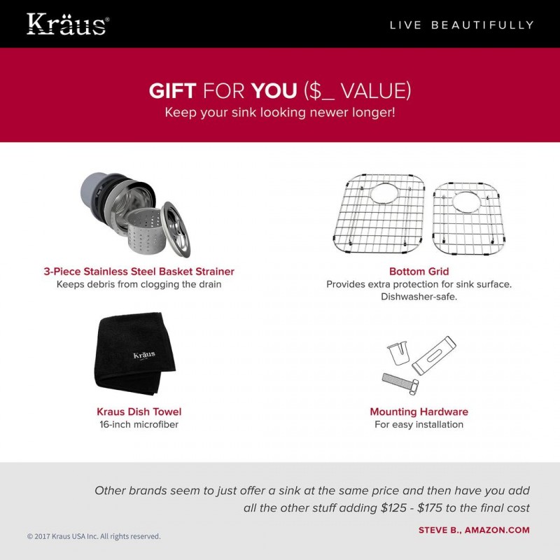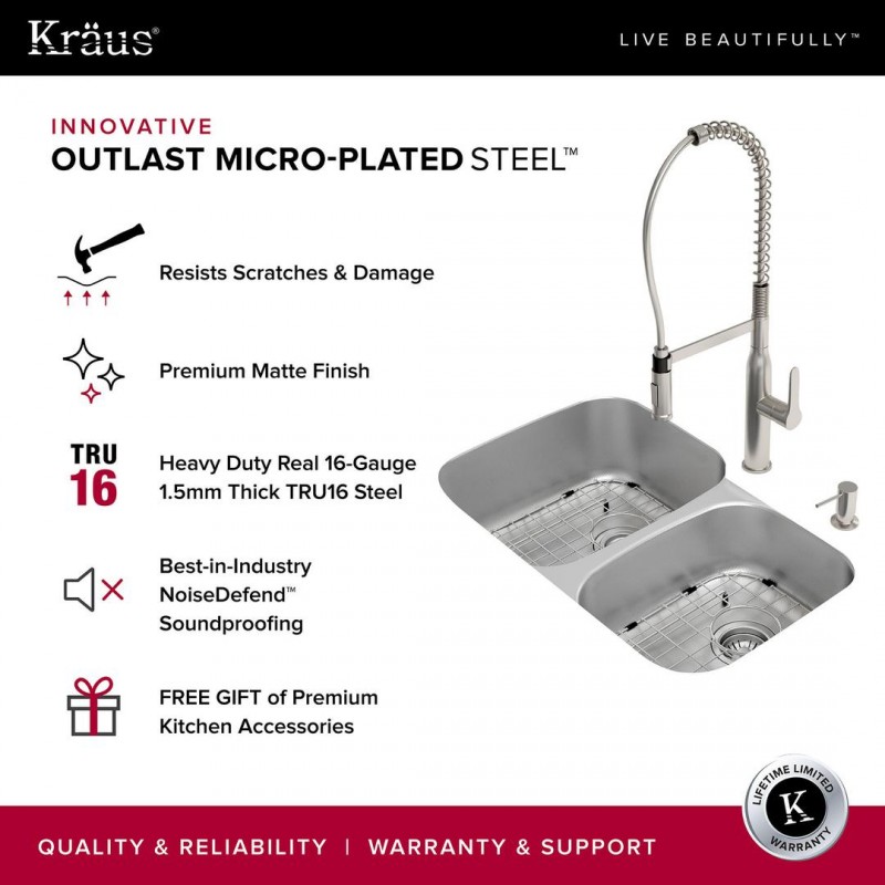 Kухонние мийки Kraus серії Premier Outlast Microshield відомі відмінною якістю і міцною конструкцією. Ці мийки нижнього монтажу виготовлені з міцної нержавіючої сталі T-304, витримують великі навантаження і легко справляються з важкими завданнями на кухні. Особлива якість матовою обробки з тисненням дозволяє легко за нею доглядати - досить протирати поверхню вологою тканиною після використання. Технологія звукоізоляції NoiseDefend ™ усуває шум і вібрацію під час використання мийки. Все мийки Kraus серії Premier Outlast Microshield комплектуються донними сітками з нержавіючої сталі з гумовимиамортизаторами, донними фільтрами і рушниками.