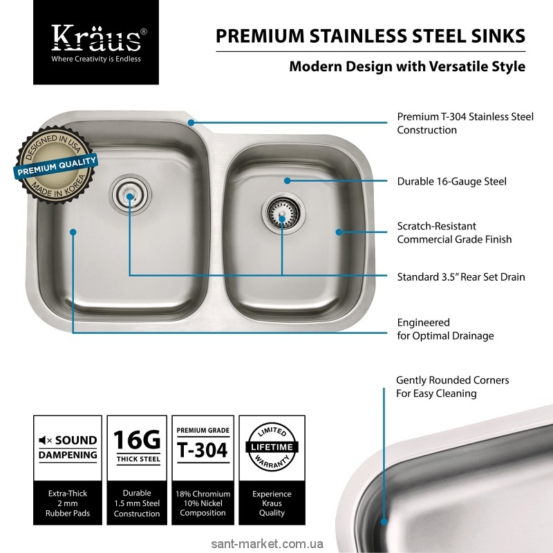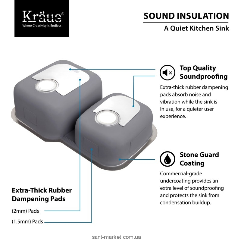 При виробництві мийок Kraus використано технологію під назвою «поглинання звуку», яка знижує шум, зазвичай пов'язаний з металевими поверхнями. Оснащена антишумовими гумовими накладками, завдяки яким відбувається пом'якшення звуку від ударів посуду чи води. Таким чином, ці мийки з нержавіючої сталі з однією чашею забезпечать вам приємну безшумну роботу.