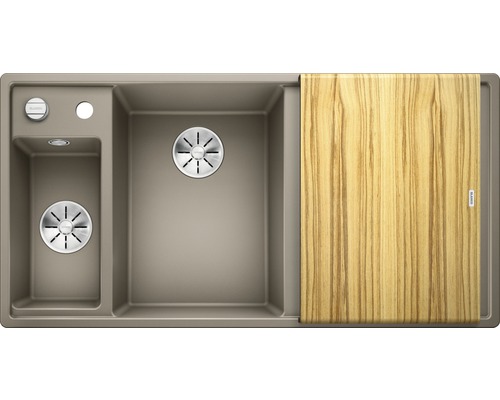 Ергономічна мийка з ультратонким плоским кантом. Особливістю мийки є малі радіуси заокруглень для максимального використання поверхні і об'єму чаші. Мийка володіє місткою основний чашею і функціональної додаткової. Велике крило зручно використовувати як для сушки посуду, так і в якості обробній зони. Ковзає по поверхні мийки обробний столик з ясена, що входить в комплект поставки, дозволяє скидати нарізані продукти безпосередньо в посуд. Коландер можна розташувати в основній чаші для легкого приготування їжі. високоякісний перелив C-overflow® і відвідна арматура InFino® елегантно інтегровані і дуже прості в догляді. Мийка поставляється з чашами зліва. Призначена для стандартного врізного монтажу, але може бути встановлена і врівень зі стільницею.