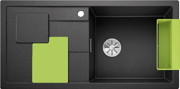 Кухонна мийка Blanco SITY XL 6 S з штучного каменю SILGRANIT ™ PuraDur ™ з відвідної арматурою InFino , гнучкою обробною дошкою і коландером. Мийка не обертатися, встановлюється в стільницю зверху. У наявність крило для зручного складання помитий посуду.