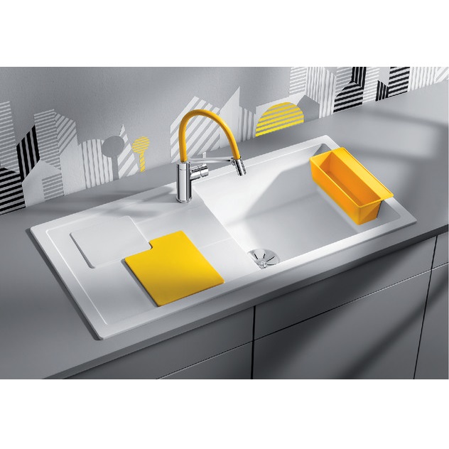 Кухонна мийка Blanco SITY XL 6 S з штучного каменю SILGRANIT ™ PuraDur ™ з відвідної арматурою InFino , гнучкою обробною дошкою і коландером. Мийка не обертатися, встановлюється в стільницю зверху. У наявність крило для зручного складання помитий посуду.