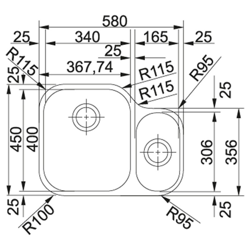 Нестандартна кухонна мийка під стільницю Franke Armonia AMX 160 (122.0021.448) з полірованої нержавіючої сталі з двома чашами без крила.