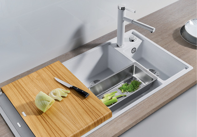 Кухонна мийка Blanco Axia III 6S – мийка зі зручним розташуванням основної чаші по центру для плавного перебігу робочого процесу. Миття оптимально поєднується з аксесуарами, як обробний столик або колландер, який можна встановити поруч із чашею. Обробний столик виконується зі ковзною поверхнею для зручного скидання нарізаних продуктів у посуд, що у чаші. Миття виробляється з відвідною арматурою InFino® з клапаном-автоматом 3½", вигідно доповнюючись сучасним та ергономічним дизайном конструкції.