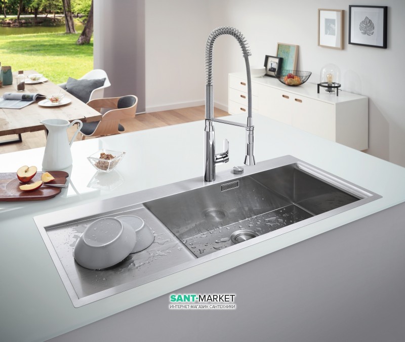 Мийка для кухні прямокутна Grohe K1000 крило зліва 1 чаша врізна нержавіюча сталь зі корзинчатим вентилем 31582SD0