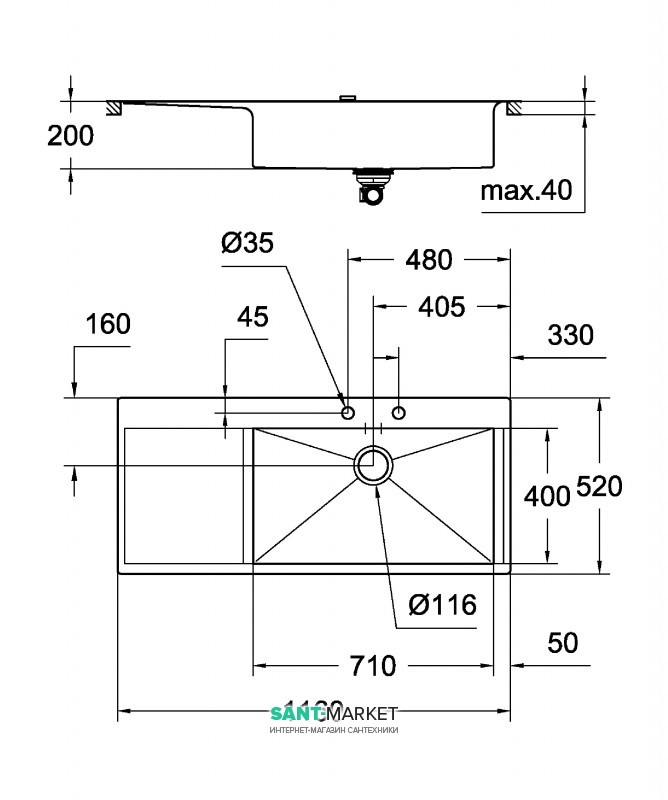 потрібний розмір отвору в стільниці для встановлення мийки: 1148 x 508 мм
