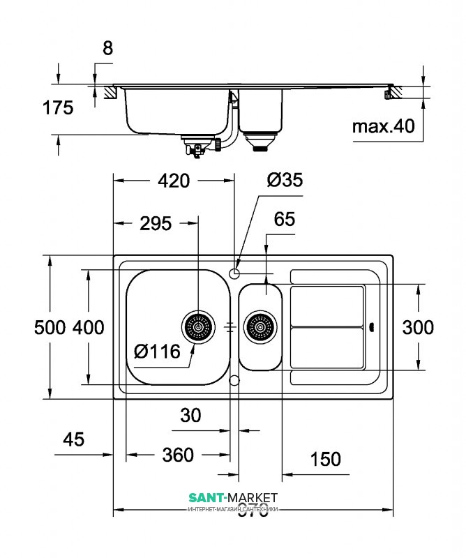 - Розміри чаші (ШхГхВ): 360 х 400 х 175 мм / 150 х 300 х 155 мм
