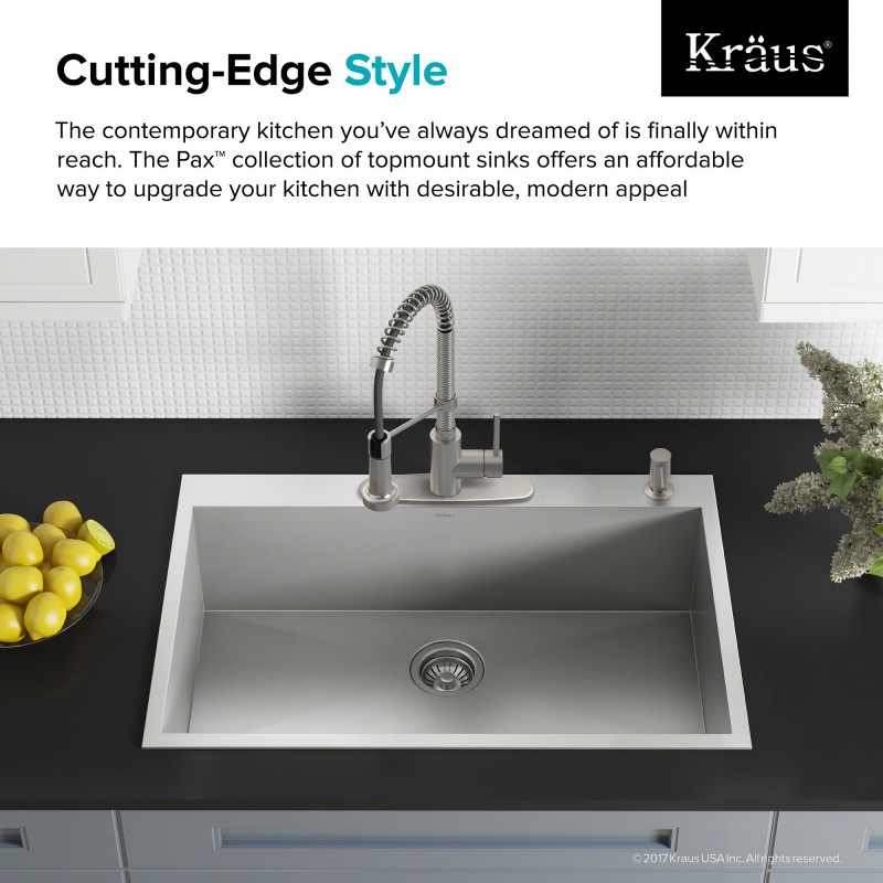 Серія накладних мийок Pax ™ пропонує зручний спосіб модернізувати вашу кухню. Серія має чистий геометричний дизайн і кути з нульовим радіусом, які забезпечують комерційну естетику, рідко зустрічається в дизайні мийок верхнього монтажу. Pax може похвалитися потужним басейном, виготовленим з товстої, міцної нержавіючої сталі 16-го калібру. Досконала сатиновая обробка комерційного рівня ніколи не потьмяніє, навіть після інтенсивного використання. Технологія звукоізоляції NoiseDefend ™ зменшує шум і вібрацію від посуду і проточної води, роблячи вашу кухню оазисом творчості іспокою.