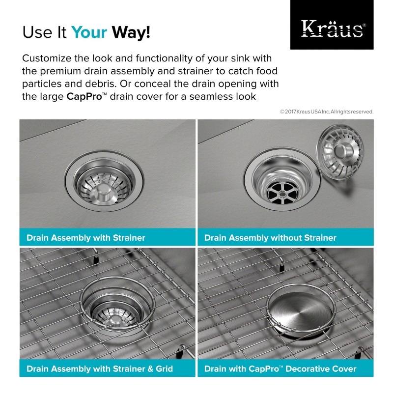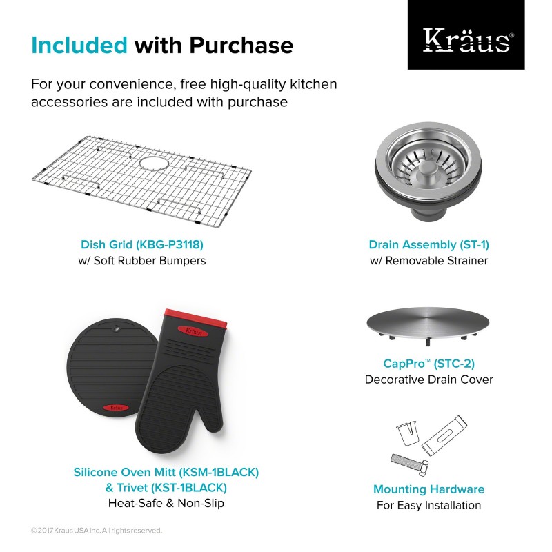 - Підготовка до встановлення: Kraus надає всі кріпильні деталі, донний фільтр ST-1, шаблон для вирізання стільниці, інструкцію по установці і догляду за раковиною.