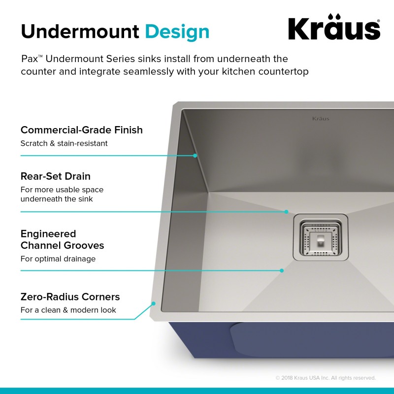 Мийки серії Pax ™ мають дизайн з кутами з нульовим радіусом для додання вашої домашньої кухні комерційного виду. Ці місткі мийки нижнього монтажу виготовлені з кращої нержавіючої сталі T-304, надміцного і екологічно чистого матеріалу. Бездоганна атласна обробка захищає від утворення плям та іржі і не буде старіти. Квадратний, розташований біля задньої стінки зливний фільтр, забезпечує більше корисної площі в раковині, а бічні стінки під кутом 95 ° не допускають розбризкування води і гарантують легку чистку мийки.