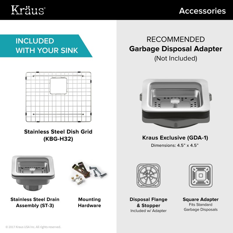 Аксесуари, які входять в комплект поставки, забезпечують додаткові зручності в експлуатації мийки. Високоякісний донний фільтр утримує залишки їжі і сміття, щоб не засмічувати слив, а донна сітка з високоякісної нержавіючої сталі захищає раковину від подряпин і підтримує посуд. Для установки подрібнювача сміття є спеціальний адаптер GDA-1 до квадратному донного фільтру (продається окремо). Створюйте найкращу кухню за допомогою мийки з серії Pax ™ Zero-Radius і насолоджуйтеся якістю і ультрасучасним стилем.