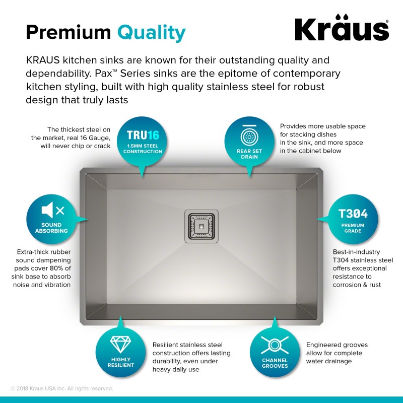 Мийки серії Pax ™ мають дизайн з кутами з нульовим радіусом для додання вашої домашньої кухні комерційного виду. Ці місткі мийки нижнього монтажу виготовлені з кращої нержавіючої сталі T-304, надміцного і екологічно чистого матеріалу. Бездоганна атласна обробка захищає від утворення плям та іржі і не буде старіти. Квадратний, розташований біля задньої стінки зливний фільтр, забезпечує більше корисної площі в раковині, а бічні стінки під кутом 95 ° не допускають розбризкування води і гарантують легку чистку мийки. Технологія звукоізоляції NoiseDefend прибирає шум і вібрацію привикористанні мийки, створюючи комфортне та творчий настрій на кухні. Кожна раковина поставляється з донної гратами з нержавіючої сталі з гумовими амортизаторами від подряпин. Всі раковини з нержавіючої сталі серії Pax ™ забезпечені фірмовою системою шумопоглинання NoiseDefend ™. Захисне грунтування використовується для подальшого зниження шуму і запобігання утворення конденсату всередині кухонної тумби. Ця технологія є удосконаленням перевіреної шумоізоляційної системи, використовуваної в популярних моделях Kraus.