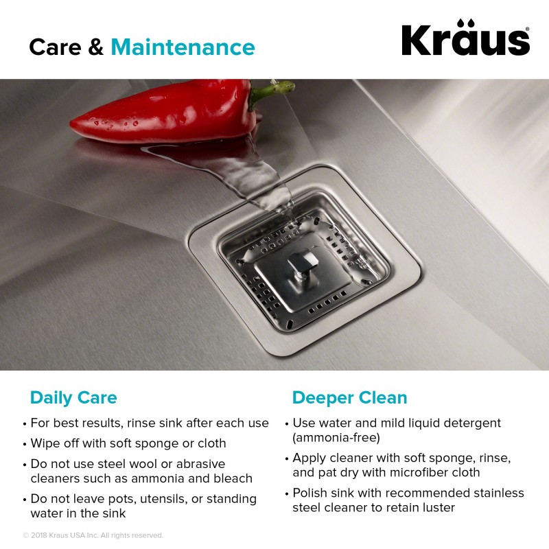 Серія Pax ™ має кілька типорозмірів мийок, які дозволяють створювати кухні з гнучкими функціональними можливостями івідповідати вашим перевагам. Всі раковини з нержавіючої сталі Kraus вимагають мінімального обслуговування і гарантують максимальний термін служби. Аксесуари, які входять в комплект поставки, забезпечують додаткові зручності в експлуатації мийки. Високоякісний донний фільтр утримує залишки їжі і сміття, щоб не засмічувати слив, а донна сітка з високоякісної нержавіючої сталі захищає раковину від подряпин і підтримує посуд. Для установки подрібнювача сміття є спеціальний адаптер GDA-1 до квадратному донного фільтру (продається окремо). Створюйте найкращу кухню за допомогою мийки з серії Pax ™ Zero-Radius і насолоджуйтеся якістюі ультрасучасним стилем.