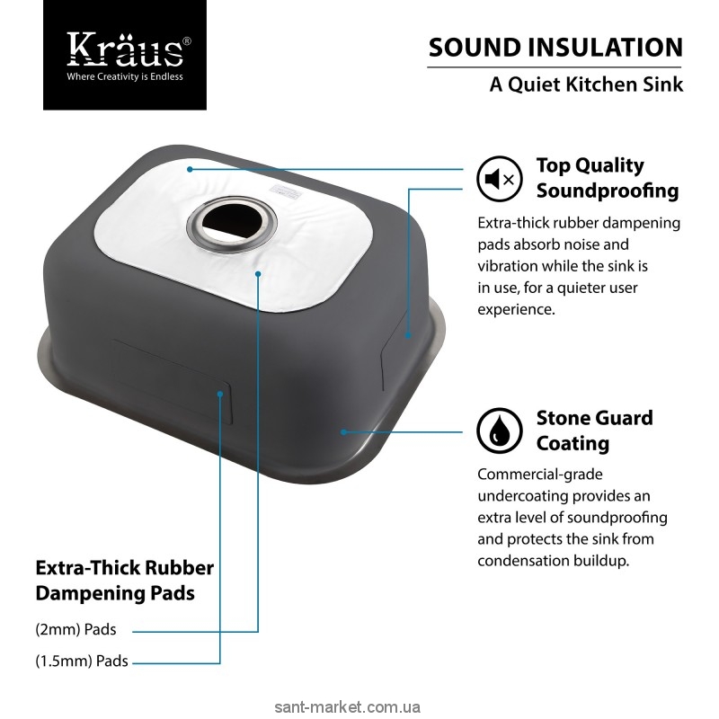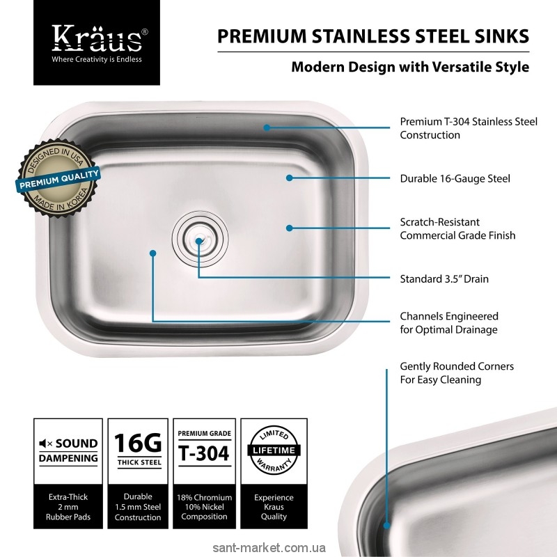 Кухонні мийки Kraus серії Premier відомі відмінною якістю та міцною конструкцією. Зроблені з міцної нержавіючої сталі T-304 ці мийки нижнього монтажу витримують щоденне використання, легко справляючись з вашими завданнями на кухні. Сатинована обробка комерційної якості забезпечує легкий догляд - досить протерти мийку вологою тканиною після використання. Мийки виготовлені із міцної зносостійкої сталі, що гарантує зниження рівня шуму та вібрації під час користування.