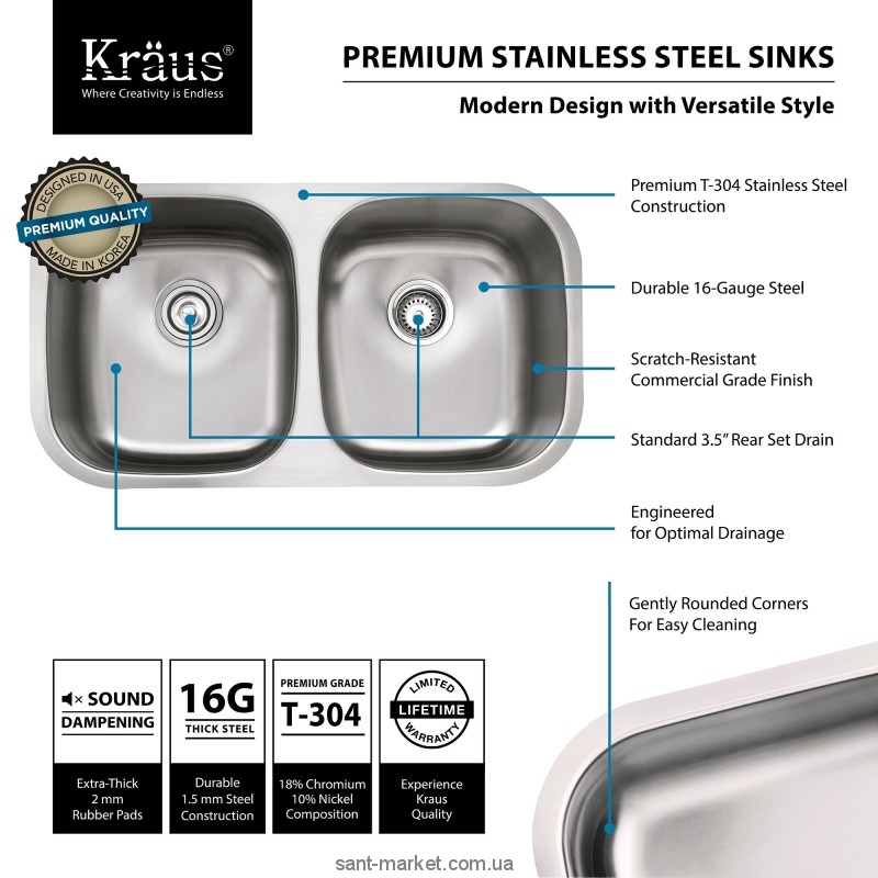 Кухонні мийки Kraus серії Premier відомі відмінною якістю та міцною конструкцією. Зроблені з міцної нержавіючої сталі T-304 ці мийки нижнього монтажу витримують щоденне використання, легко справляючись з вашими завданнями на кухні. Сатинована обробка комерційної якості забезпечує легкий догляд - досить протерти мийку вологою тканиною після використання. Мийки виготовлені із міцної зносостійкої сталі, що гарантує зниження рівня шуму та вібрації під час користування.