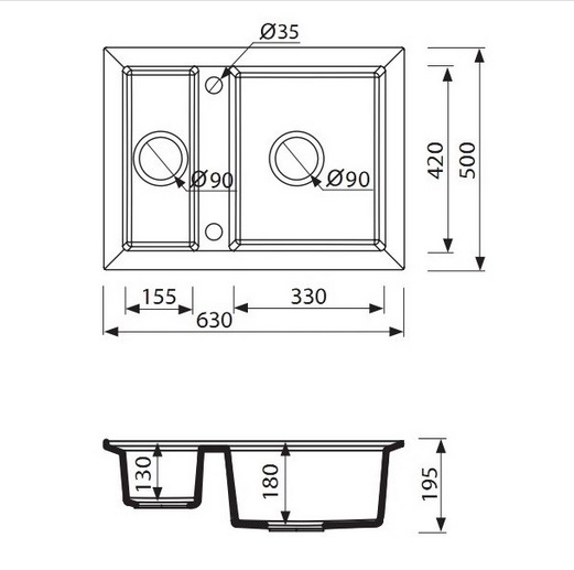 - Розмір 2 чаші: 155х420х130 мм