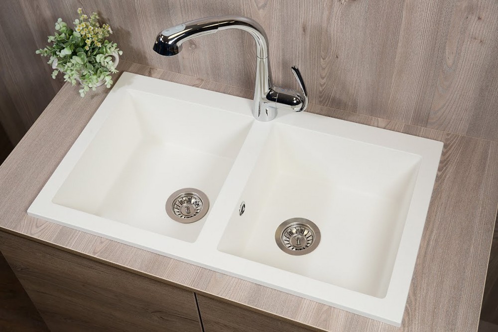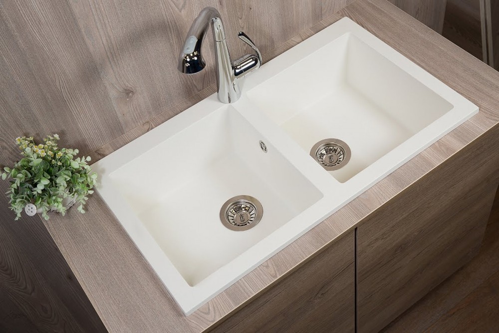 1) Мийка для кухні прямокутна подвійна Буль-Буль Westeros врізна Маграніт білий