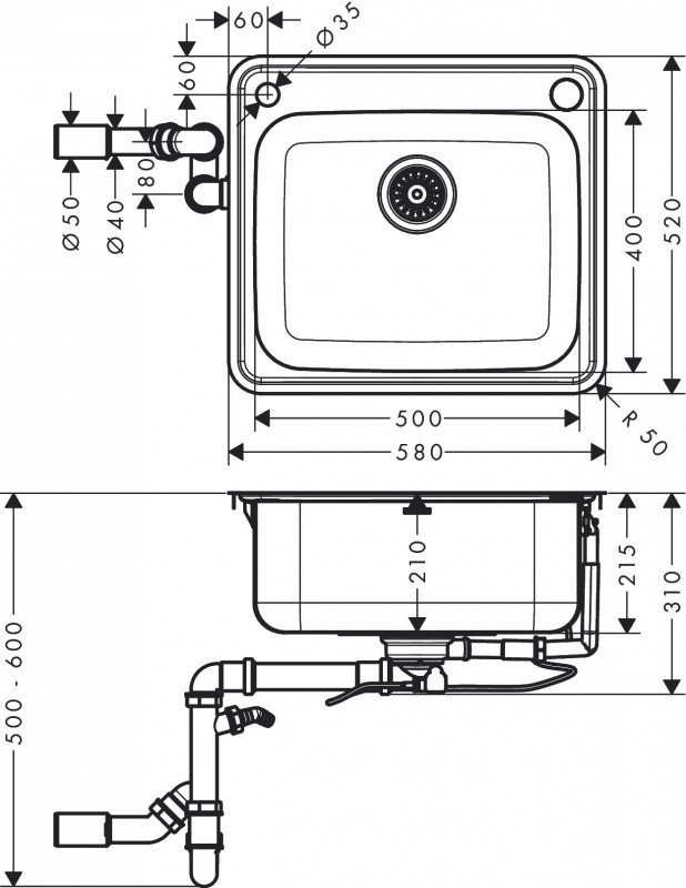 1) Мийка для кухні вбудована Hansgrohe S41 S412-F500 нержавіюча сталь
