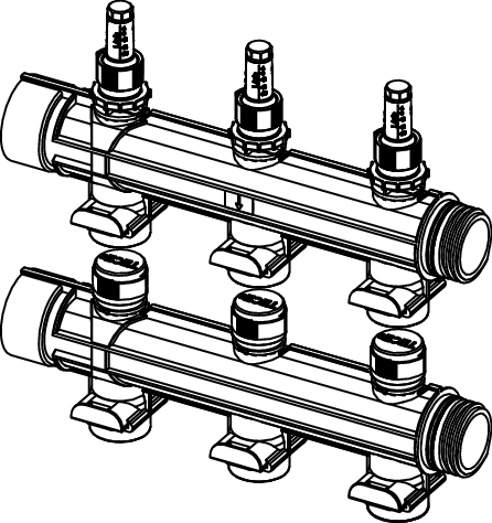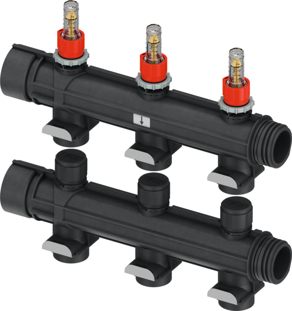 Промисловий колекторний модуль для опалення, 2-20контури опалення можуть бути додані модульно, ущільнювальне кільце ущільнювача, сегмент потоку з витратоміром 4-20 л/хв, сегмент повернення з вбудованим клапаном. Для з’єднання труб TECEfloor PE-RT 5S 25x2,5 мм за допомогою з’єднувального адаптера TECEfloor.