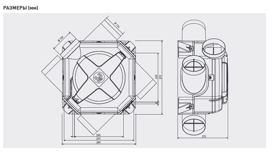 - 4 Ø125 мм патрубка для підключення витяжних повітропроводів, з ущільнювачами і можливістю повороту на 90º.