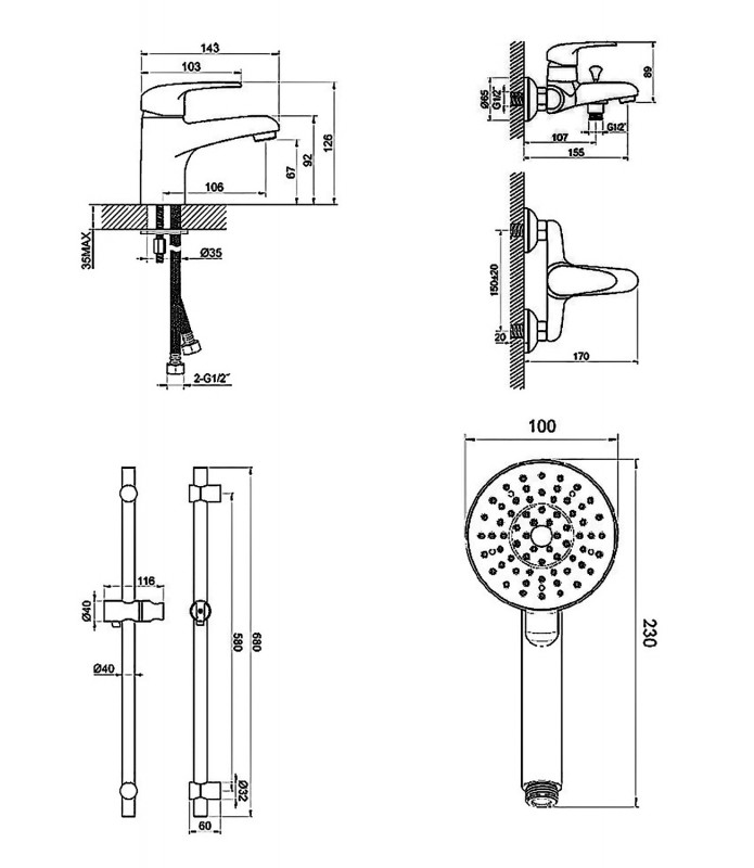 Набір змішувачів 1623190128SP серії Giran від Devit складається з врізного,одноважільного змішувача для раковини зі стаціонарним виливом з виносом в 10.6 см, настінного, одноважільного змішувача для ванни з виносом виливу в 10.7 см, круглої душової лійки діаметром 10 см з душовим шлангом, а також, душової штанги з інтегрованим тримачем для ручної лійки висотою 68 см .