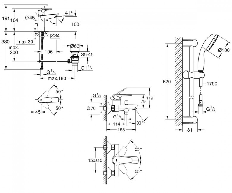 - Дивитися інші: Комплекти змішувач для ванної з душовим гарнітуром Grohe
