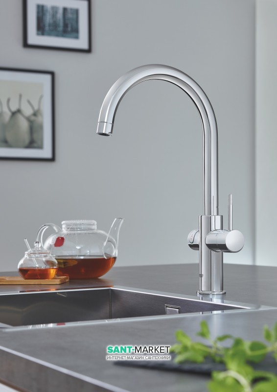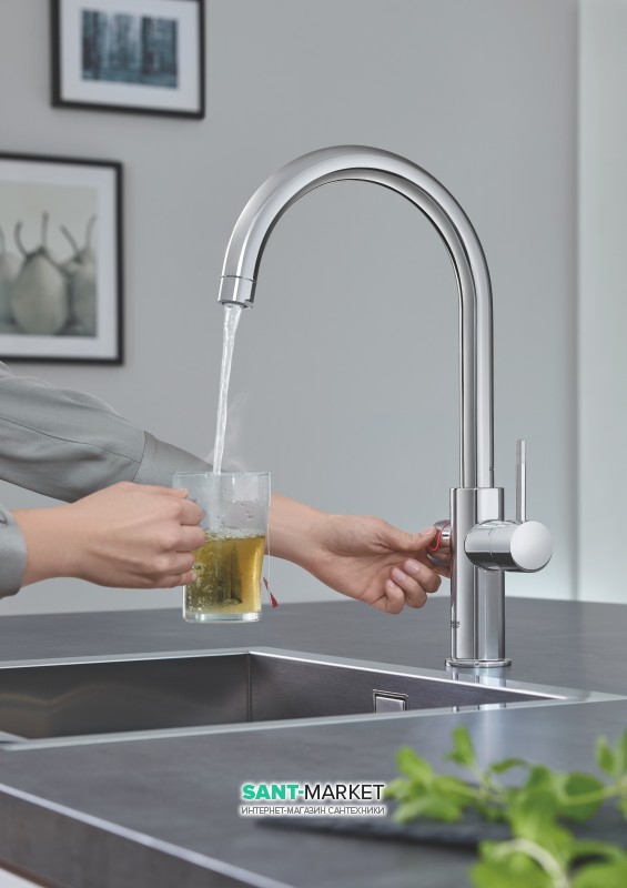 Система фільтрації води з функцією кип'ятіння GROHE Red – інноваційне рішення для вашої кухні. Щоб отримати гарячу воду для заварювання чаю, досить просто піднести чашку до змішувача і натиснути кнопку!