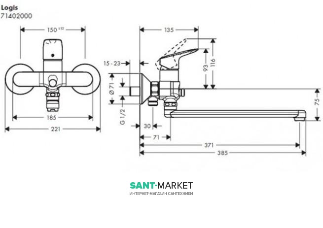 - Змішувач одинважільний для ванни з довгим виливом HANSGROHE LOGIS 71402000