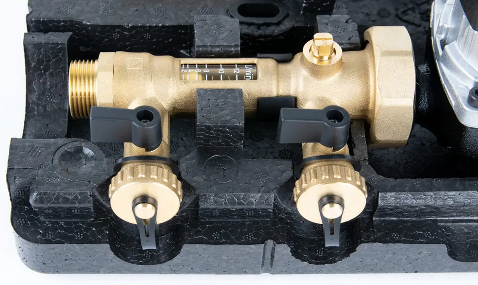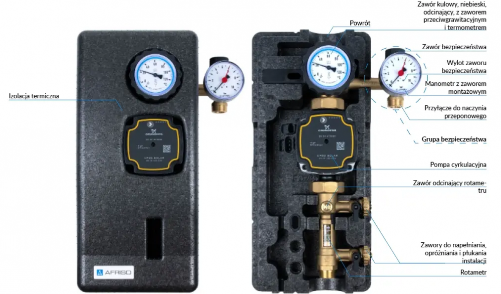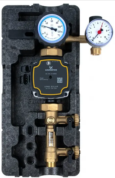 Насосна група для сонячних установок PrimoSol 130-1 із циркуляційним насосом. Насосна група PrimoSol – це набір пристроїв для регулювання систем, оснащених сонячними колекторами. Комплект включає: витратомір 2-12 л/хв зі з'єднаннями для наповнення системи, циркуляційний насос Grundfos UPM3 Solar 25-75 (130 мм), група безпеки з запобіжним клапаном 6 бар і манометром 0-10 бар, запобіжним клапаном, запірним краном з термометром, вбудованим у ручці. Все розміщується в ізоляції.