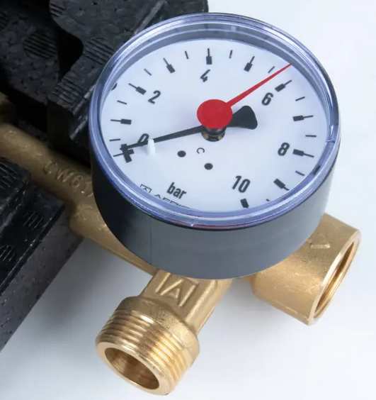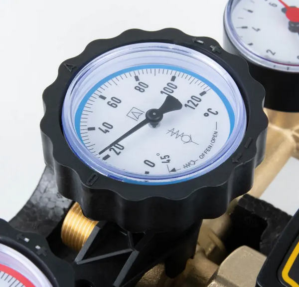 2) Кульовий кран з гравітаційним гальмом, термометром (синій) та з'єднанням для групи безпеки