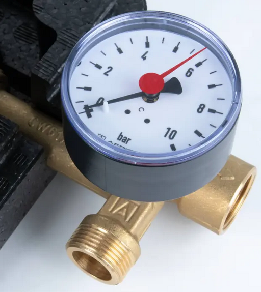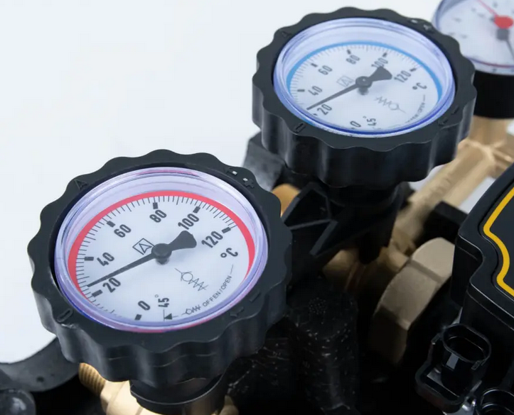 2) Кульовий кран з гравітаційним гальмом, термометром (синій) та з'єднанням для групи безпеки