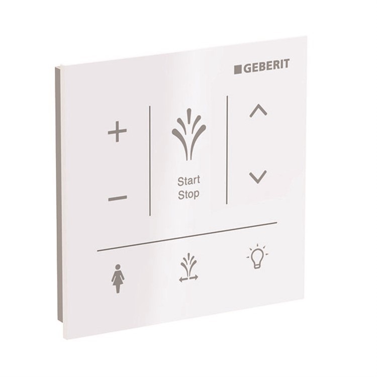 На додаток до пульта дистанційного керування є також настінна панель управління для роботи з Geberit AquaCleanMera . Панель управління може бути встановлена в будь-якому місці і загвинчена або щільно приклеєна до стіни без необхідності в кабелях. Основні функції душового туалету можна експлуатувати легко і інтуїтивно. Панель управління також не повинна враховуватися на стадії планування, так як вона працює від батареї і підключається до туалетного елементу управління через Bluetooth.