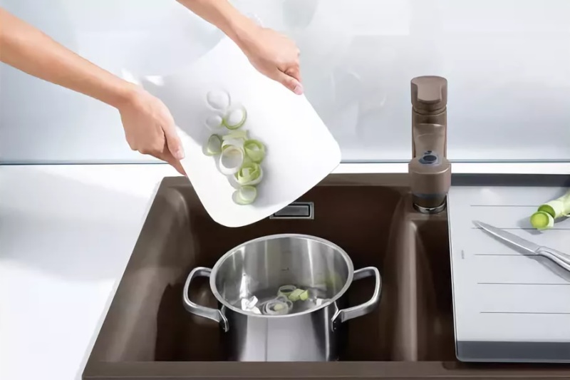 Гнучкість дошки дозволяє переносити або скидати дрібно нарізані овочі, зелень, фрукти в каструлі, бутлі або графини навіть з маленьким діаметром горловини. Досить просто зігнути дошку.