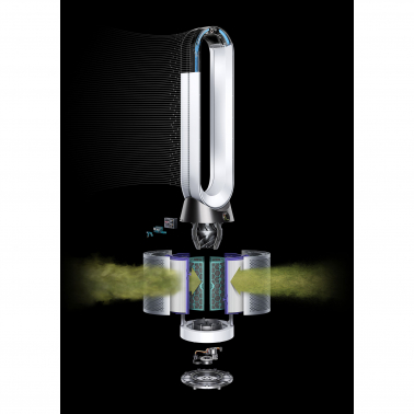Повітряочищувач DYSON Pure Cool TP05 оснащений фільтрами грубого очищення, НЕРА і вугільним. В результаті проходження через них повітря позбавляється будь-яких шкідливих домішок. Робота в автоматичному режимі зручна днем, а вночі краще вибрати відповідний режим - пристрій функціонує з тьмянимекраном і виробляє мінімальний шум, продовжуючи підтримувати найкращу якість повітря і необхідну температуру. Зручність управління забезпечує наявність в комплекті пульта дистанційного керування. Устаткування показує рівень забруднення повітря. Після його роботи будуть усунені шкідливі речовини розміром менше 0.1 мікрона, а також віруси і бактерії. Поміняти фільтр можна швидко і легко, щоб надовго не переривати процес очищення повітря.