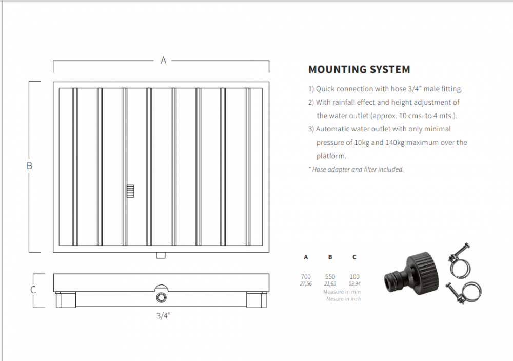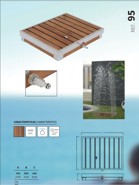 AQA душ на відкритому повітрі з нержавіючої сталі з вбудованим якорем для міцного кріплення до підлоги. Функціональний і сучасний дизайн в відповідності з останніми тенденціями в зовнішній обробці, він включає в себе самі передові технології, які гарантують експлуатацію і тривалий термін служби. Душ необхідний для будь-якого будинку з басейном, так як він допомагає вам видаляти з шкіри хімічні речовини після купання в хлорованій воді.