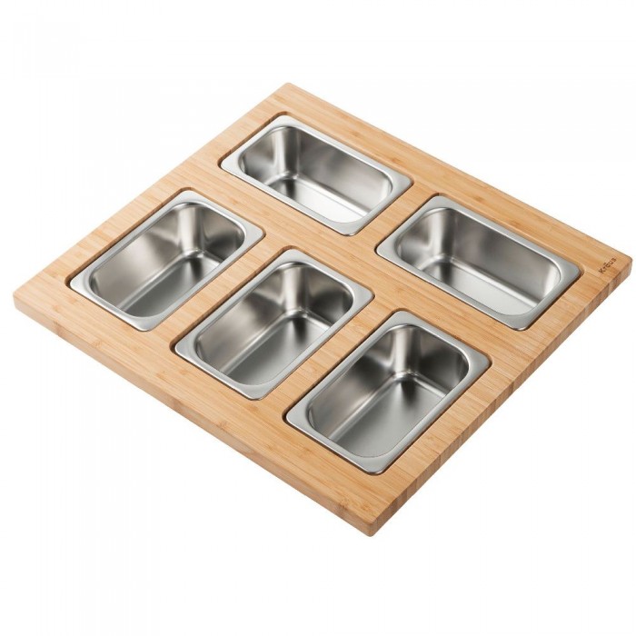 Перетворіть свою мийку KRAUS Workstation в простір для готування за допомогою підставки під аксесуари, яка пересувається по інтегрованому виступу. 100% органічна дошка для сервірування з бамбука, розміщує миски з нержавіючої сталі, які ідеально підходять для приготування інгредієнтів або подачі закусок і страв. Обтічний дизайн спрощує ваш робочий процес на кухні, зберігаючи інгредієнти під рукою, і створює легкий перехід від приготування до сервіровки.