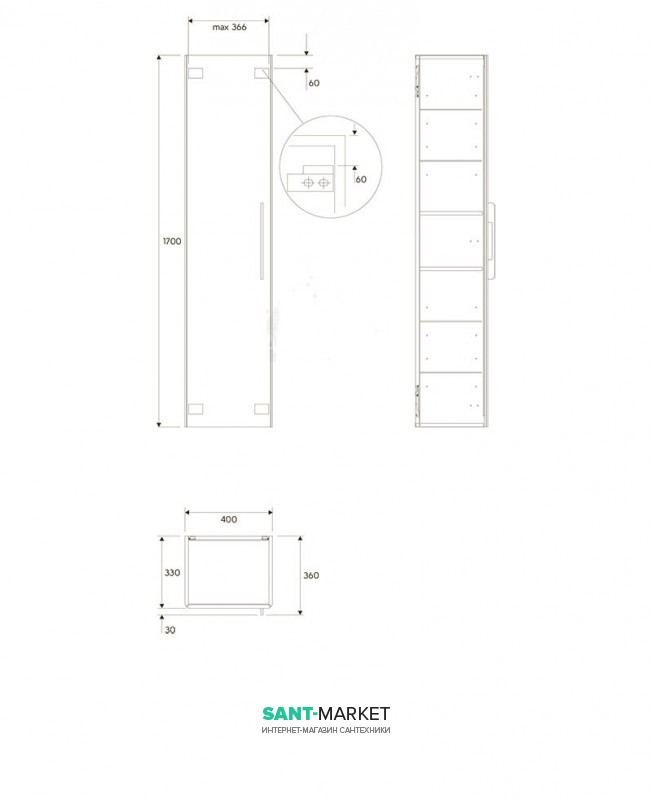 1 дзеркало всередині. 2 нерегульовані полиці з ДСП, 4 регульовані скляні полиці