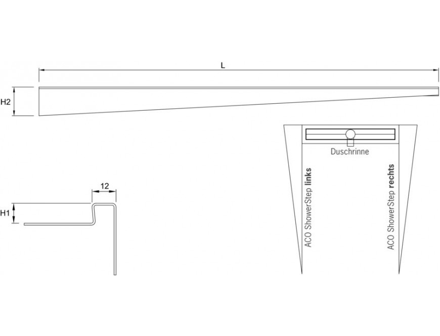 ACO ShowerStep - вирівнюючий елемент для підлоги. Призначений для установки в зоні між вбудованим каналом і прилеглої областю ванної кімнати. Ванна кімната не має ухилу поверхні, в той час як безпосередньо душова зона з одностороннім ухилом 1.5-2% до душового каналу. Цей ухил створює перепад висот між двома областями. ACO ShowerStep забезпечує непомітний перехід між двома зонами, таким чином утворюючи рівну поверхню.