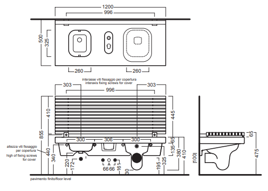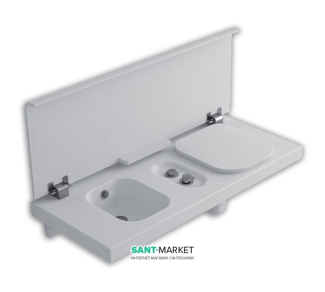 Багатофункціональна лава з унітазом і біде без переливу, права версія (унітаз праворуч). У комплекті з біде змішувач з подвійним припливом, дистанційної кнопкою. Біла лакована кришка, з м'яким закриттям. Монтаж спеціальним кронштейном для цегляних стін, або з спеціальним правим / лівим кронштейном для стіни з гіпсокартону, можна поєднати ззливним бачком Geberit "Sigma 8". Можна інтегрувати з білим шафою.